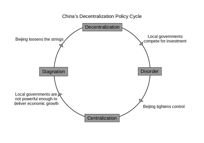 A large part of China's economic growth has come from the right amount of decentralisation. What is that right amount? There is no answer to this question. There does seem to be a "tolerable" level of decentralisation though, because the government in Beijing is stuck in a policy cycle with alternating periods of centralization and decentralisation. This diagram illustrates the cycle.