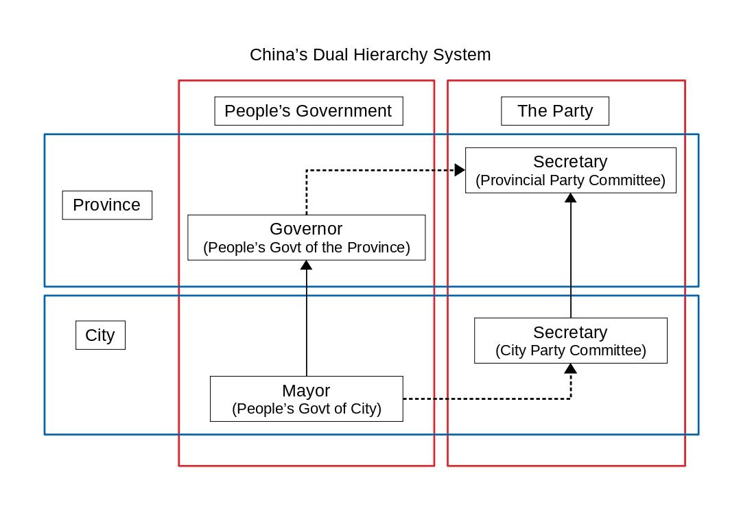 In this diagram, the solid lines are real reporting lines. (i.e. The mayor is officially answerable to the governor.) And the dotted lines are part of the Party system. The Mayor unofficially reports to the Secretary of the City Party Committee. Ultimately, its existence is not something which can be proved through documents or journalistic reporting. McGregor's claim that this line exists is based on his experiences in China. Throughout the book, he gives many examples that reinforce his point that the dotted line exists and takes precedence over the solid line. (One of my complaints with the book is the way in which McGregor assumes the existence of this line in some parts of the book, instead of trying to prove otherwise and having to resort to its existence despite his best efforts.)