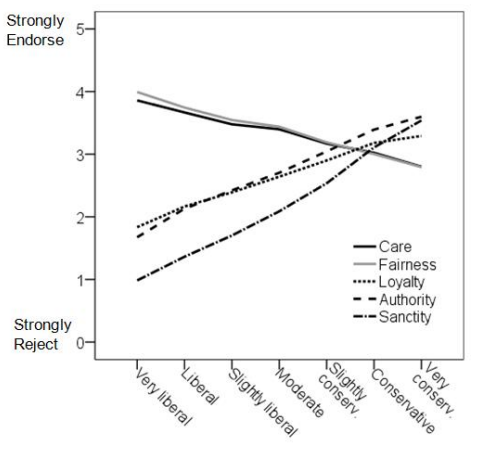 An interesting finding about these foundations is that they vary between liberals and conservatives (these terms are just used to mean left wing and right wing). Liberals are strongly activated by the care/harm foundation (helping the oppressed) and fairness foundation (as equality, as in “Racial Justice” etc.). But they are only weakly activated by the others. Conservatives are about equally activated by all five foundations. Here’s a graph.
