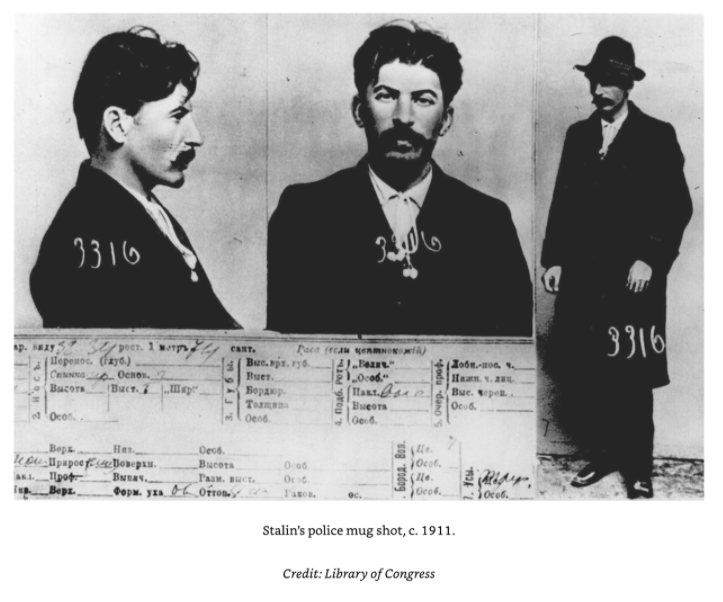Young Stalin, too, served an exile sentence in tsarist Siberia — but the enforcement was so lax that he later bragged about having left Siberia 6 times during his sentence. Here’s his 1911 mugshot: