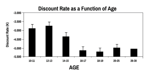 We now move on to laboratory literature mainly focused on “adolescent risk taking.” This literature is somewhat well developed and attempts to measure “hot judgment ability.” One study in this literature measured the ability of teens and older people to delay a $1000 dollar award by offering them cheaper rewards immediately. A “discount rate” was calculated based on how little money they were willing to go to get the money immediately.