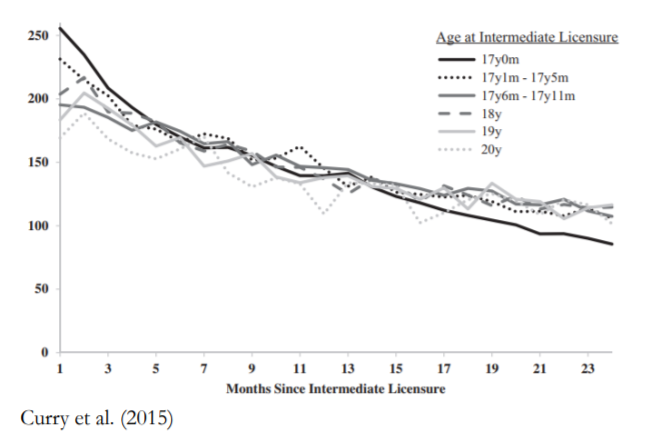 Another study used a driving game where the risk of crashing was ambiguous and drivers were rewarded for driving through lights. While younger teens exhibited riskier driving behavior, the 16-17 year old age group experienced mature levels of risky driving on par with those of adults (Steinberg et al. 2008).