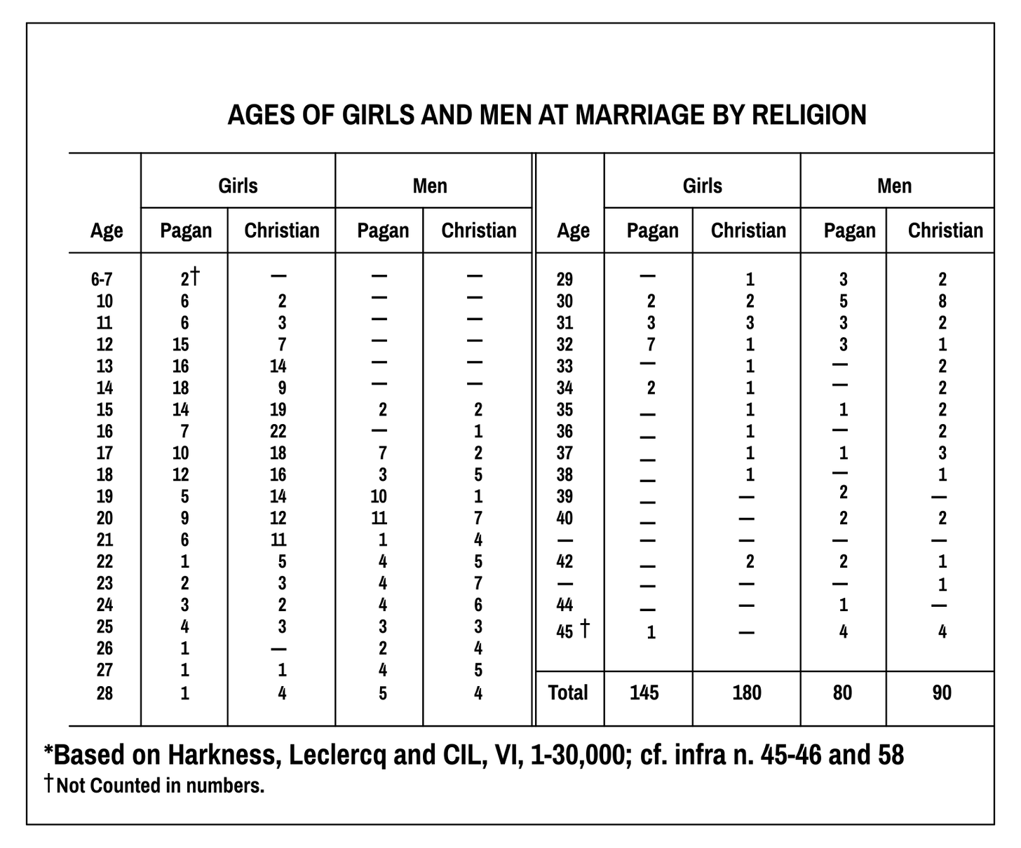 The book contains five chapters: A Summary of Historical Youth Norms, Education, Development, The Teen Brain Meme, and Applications. The first chapter provides evidence that post-modern youth is largely ahistorical – this chart on Ancient Roman marriage sums it up well: