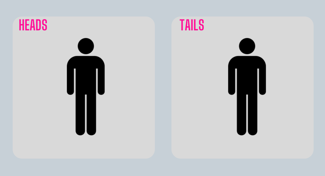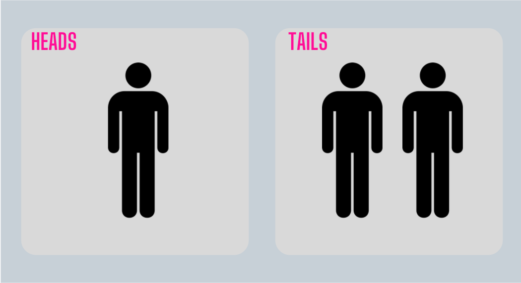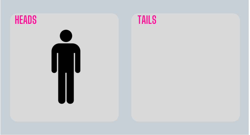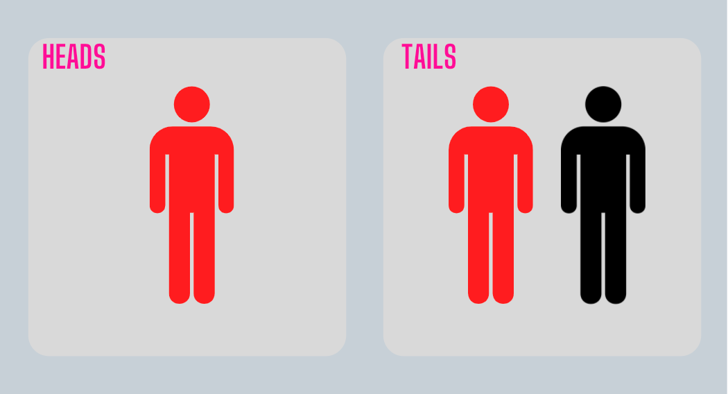 Heads = 1 human in red jacket; Tails = 1 human in red jacket, 1 human in black jacket.