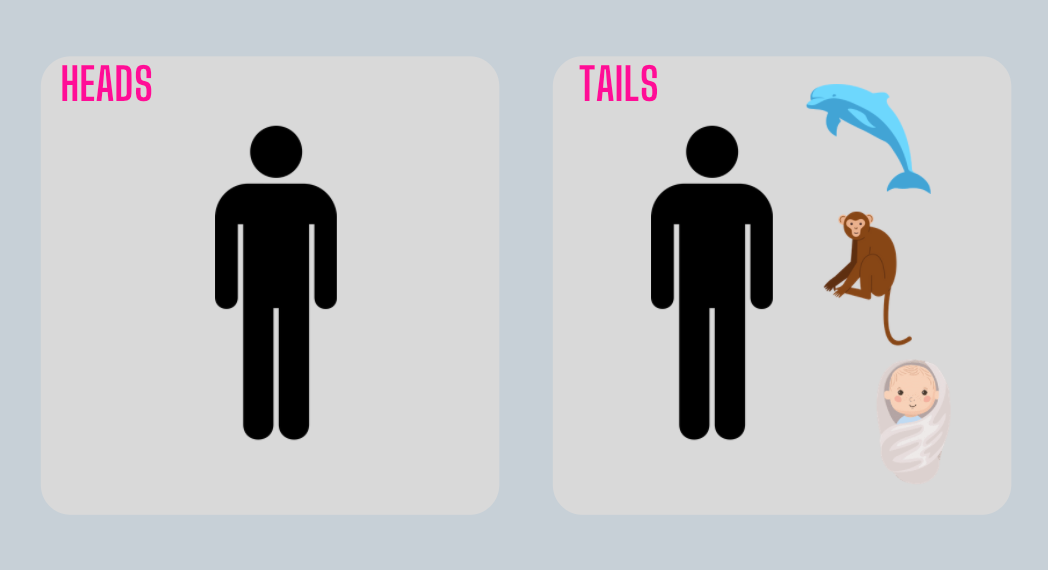 Consider our coin toss experiment again. You wake up. God planned to create one human in one room if heads. However, if tails, God planned to create a whole menagerie: one human, one chimpanzee, one dolphin, and one newborn infant. Which way did the coin land?