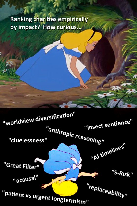 Panel 1: Alice from Alice in Wonderland looking into a rabbit hole saying “Ranking charities empirically by impact? How curious…”