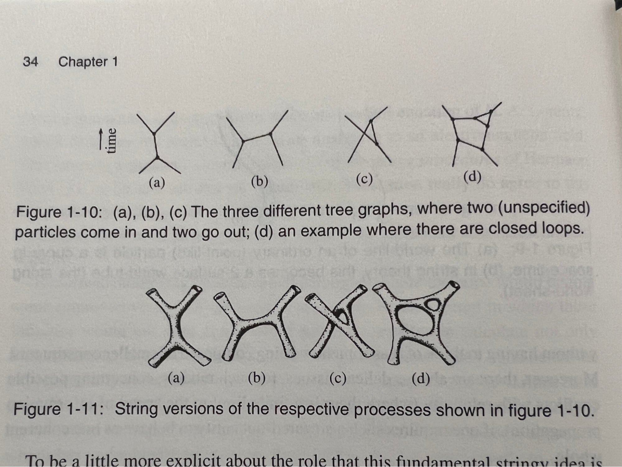 String theory came about through a revolution in Quantum Field Theory, or QFT, in the 60s and 70s. It promised to resolve some anomalies involving infinities. QFT described some particle interactions using “Feynman diagrams”, basically just tracing the paths of particles over time. But when the diagrams had loops in them, QFT’s math could get really weird. Sometimes calculations even diverged, producing infinite answers. The actual energies involved are definitely finite, so a new approach was needed. String theory offered that new approach by transforming the lines of Feynman diagrams (figure 1-10) into surfaces and tubes (1-11).