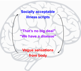 This perspective, though surely an improvement on gynecologic surgery, had a major drawback. Physicians bought into the psychological paradigm and used it for the next century (and still do). But many patients hated it (and still do). Why? The psychological model for somatization implies that symptoms are separable into “organic” phenomena arising from the body and “psychological” phenomena arising from the mind. People aren’t dumb. This sounds a lot like some symptoms are legitimate, and others are in your mind - illegitimate.