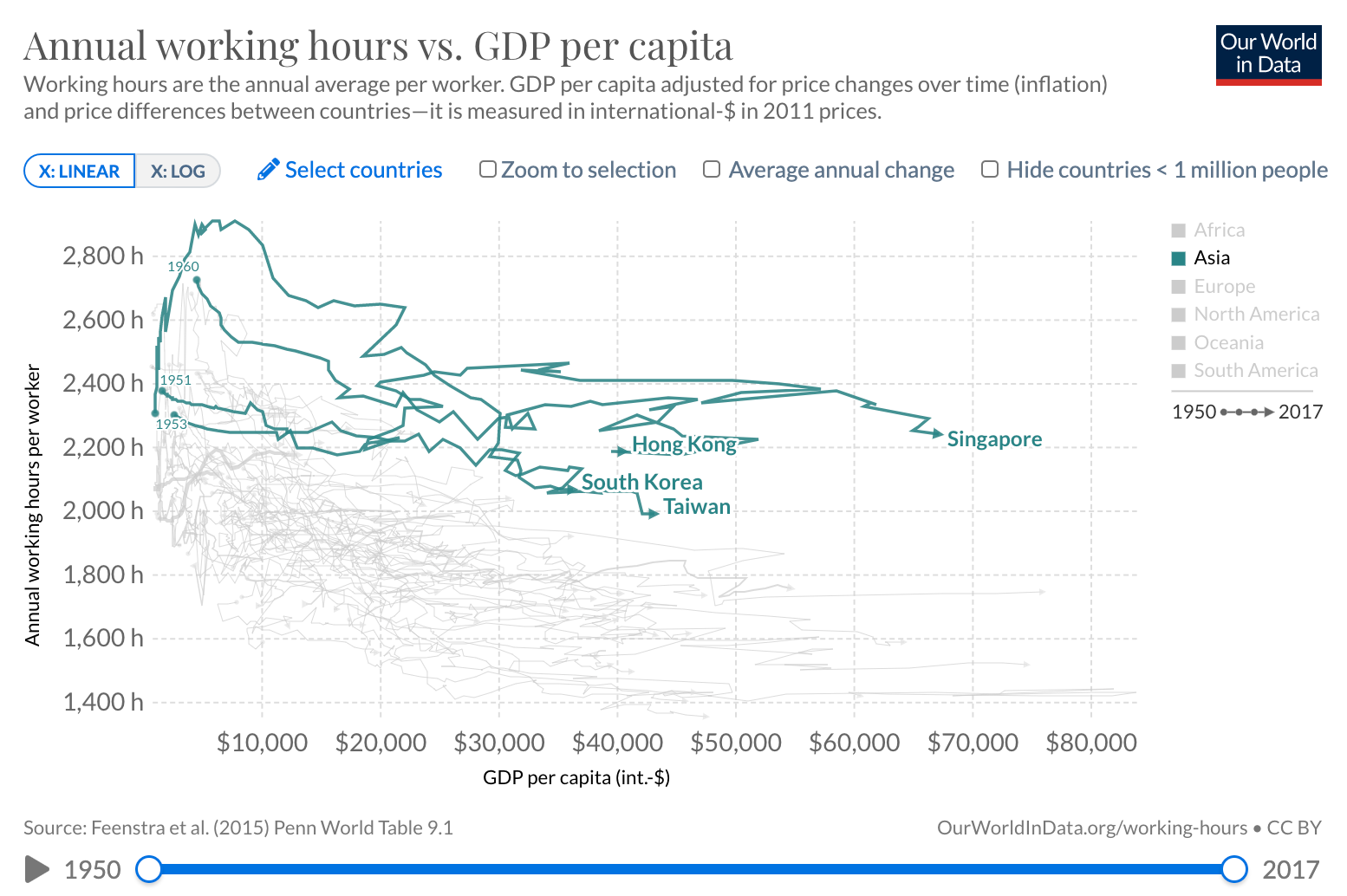 South-East Asian ‘tiger economies’ (Singapore, Hong Kong, South Korea and Taiwan), which underwent rapid economic growth through the 1960s to the present, stand out as outliers. But even then, with the exception of Singapore, they saw a decline of work hours in the face of economic growth.