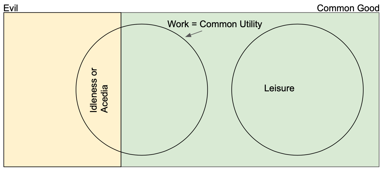 Secondly, like work, leisure is good. Because it stands in contrast to idleness or acedia. While idleness in the negative is understood as a lack of economic ambition, the meaning of acedia is more theological. Acedia can be understood as existential despair, a disagreement with oneself, “a sin against the Sabbath, against "The soul's resting in God””. Work on the other hand doesn’t necessarily have to be good. It can take on the additional character of idleness/acedia despite being a pursuit of common utility.