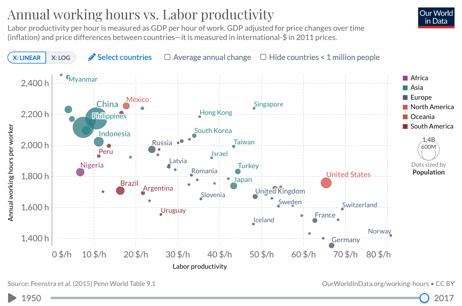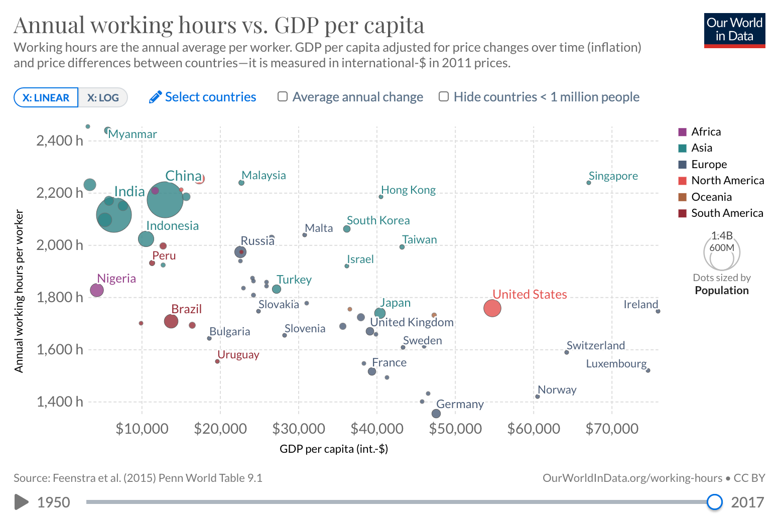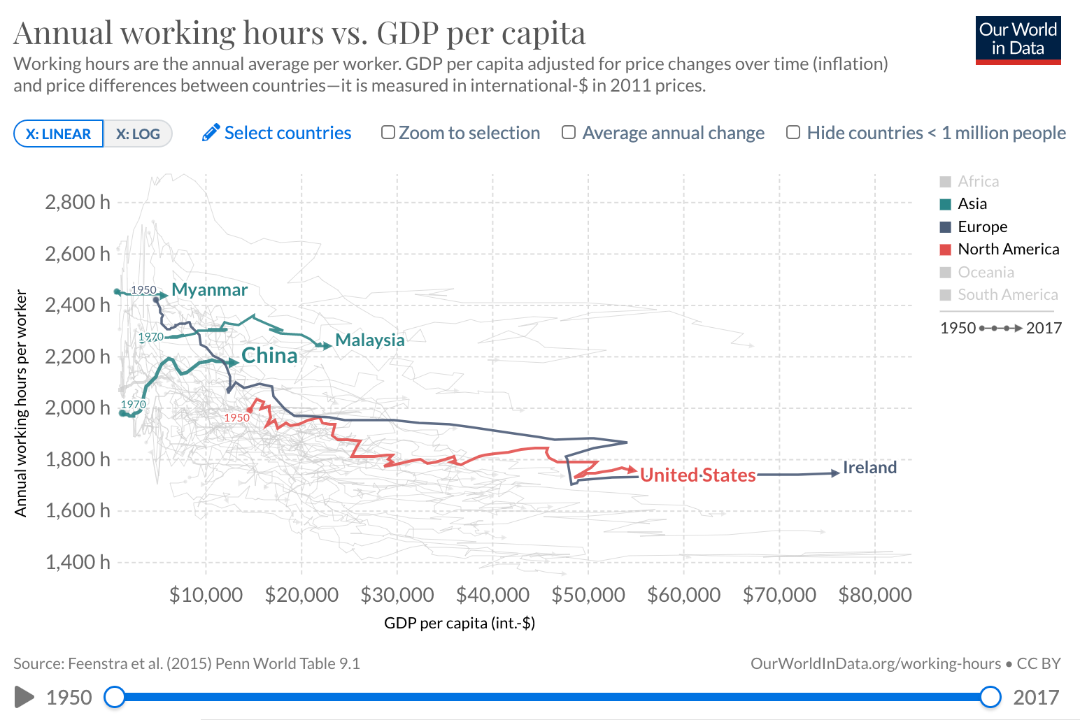 Finally, this relationship between GDP / GDP growth and working hours also means that, on average, the higher your productivity (in dollar terms), the less you work.