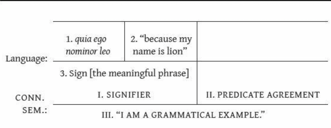 A more thorough examination reveals that these statements are neither exactly literal nor exactly figurative; Wedemeyer goes a meta-level up, from purely denotative to connotative language, and specifically to connotative semiotics, by which a complete sign (signifier+signified) becomes the signified component of a larger sign. He gives an example pulled from Barthes, the Latin phrase quia ego nominor leo, which means ‘because my name is lion.’ In purely denotative language, the phrase is the signifier, a particular statement about one’s name is the signified, and the whole thing together is a sign. But here, in this connotative system, that sign is the signifier which points to another signified, the ultimate goal of communication; which in this case, is a grammatical example. Quia ego nominor leo is an example of predicate agreement.