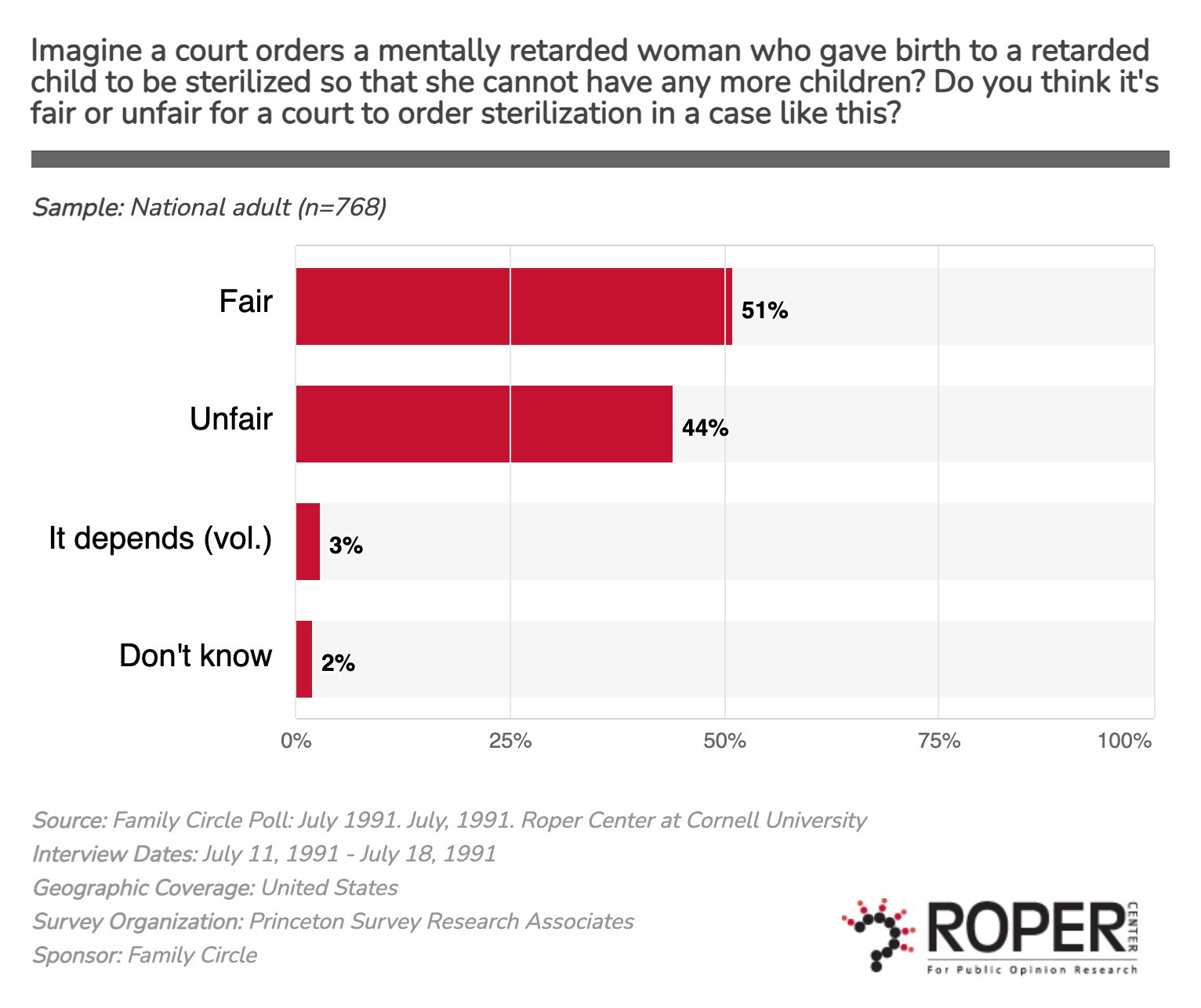 Or maybe even further. You might think something like forced sterilization, one of the nastiest parts of eugenics, fell out of favor after World War II. But forced sterilizations were common in the US until the 1970s, and California may have been pressuring female prisoners into getting tubal ligations as recently as 2010. I can’t find more recent polling data, but it seems like even 30 years ago people thought forced sterilization was fine in at least some cases:
