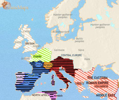 It reminded me of the 3-century-long war between Arian and Nicean Christians (500-800 CE), which destroyed the Western Roman Empire and cast western Europe into its Dark Age. Here’s a map of Europe in 500 CE[zzmap], with diagonal white stripes across the Nicene territories and horizontal black stripes across the Arian territories: