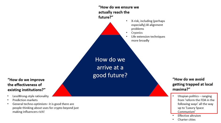 I tend to think of utopian politics as the third point of a triangle of futurist / rationalist beliefs (sketched below), and I appreciate that puts me in a distinct minority of rationalists – the canonical belief is that “politics is the mind killer” and that getting involved in politics is somewhat unseemly and best left for odd-numbered Open Threads. I don’t think that’s true (or even a fair reading of the linked LessWrong article) – the point is that invoking tribal politics is a certain way to fail to make your point and shut down any potential for productive future discussions. However, discussing utopian politics – how we would like the world to look in the future – doesn’t automatically lead to that problem because if you’re doing it right the issues which are Culture-Warsy today should look as silly to future societies as the Culture-Warsy issues of previous societies look to us (does anyone today care about the gold standard vs bimetallic standard debate, for example?). Indeed, I don’t really understand what rationalism is for if rationalists don’t want to talk about what they want the world to look like when all biases are overcome, when all wrongness has been lessened and when the tenth and final codex is completed.