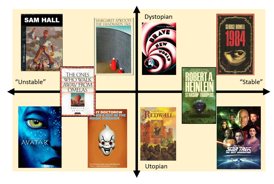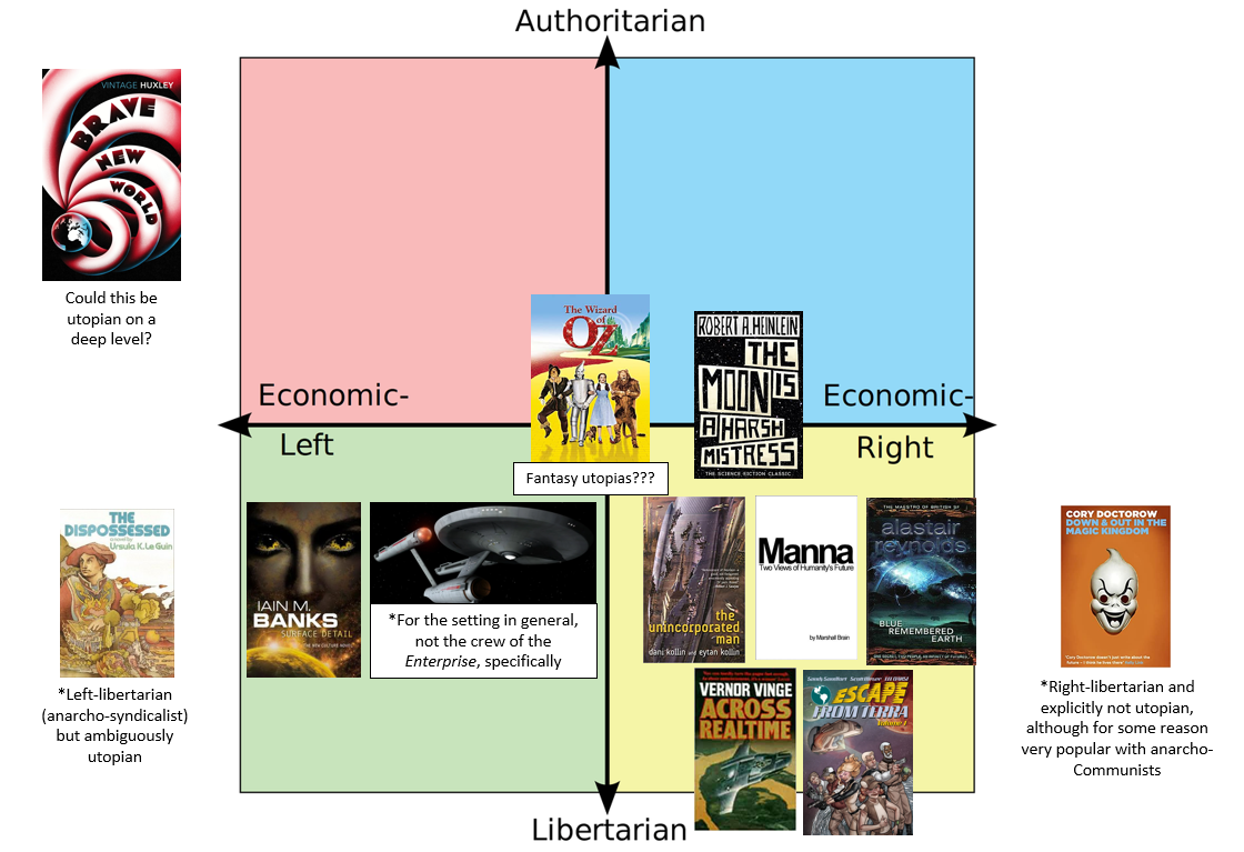 With the above definition in mind, I think there are really only a very small handful of fictional worlds (in the English-language canon) that can fairly be described as utopian. I’ve arranged them on the political compass diagram below because I think it shows something quite insightful about fictional utopias.