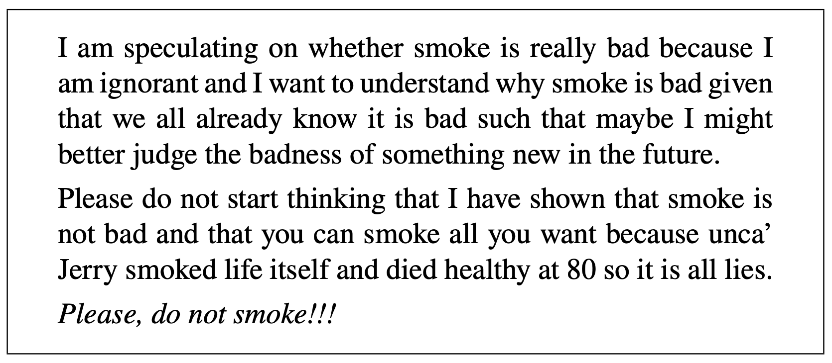 (Spoiler: it ends with people thinking that maybe inhaling burned stuff is not so bad and it gets soft-banned very slowly causing—yes, causing indeed—millions of additional easily preventable deaths.)