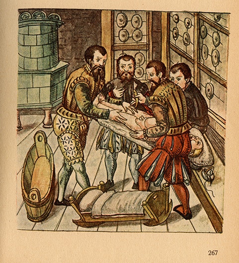 Caption: Image showing surgical preparation for testicular castration, from Caspar Stromayr’s Practica copiosa, completed in 1559