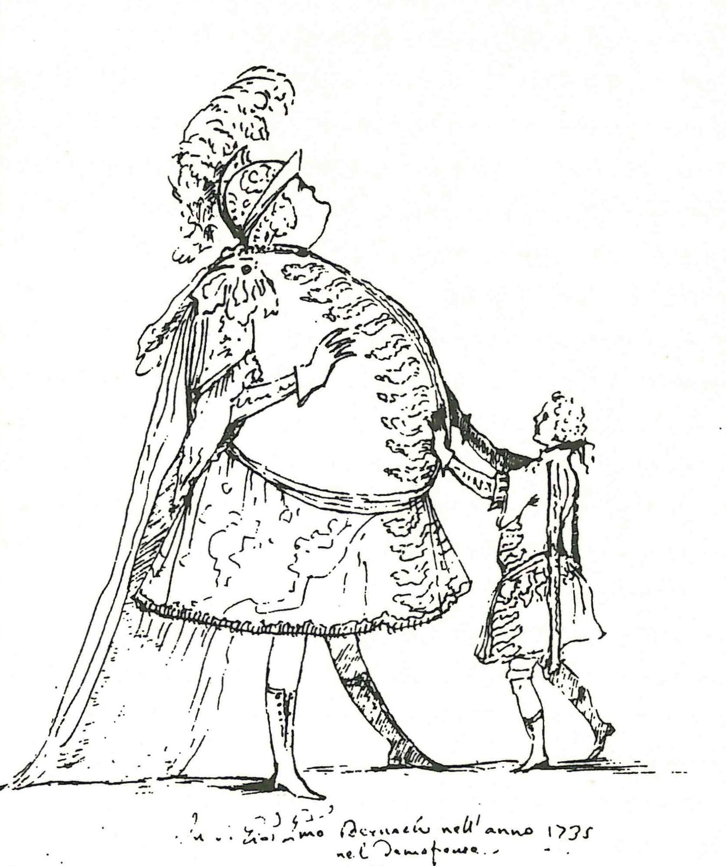 caption: Caricature of Bernacchi with belly held aloft by a page (Anton Maria Zanetti, 1735). Castrati were frequently satirized for their unusually large size and tall stature.