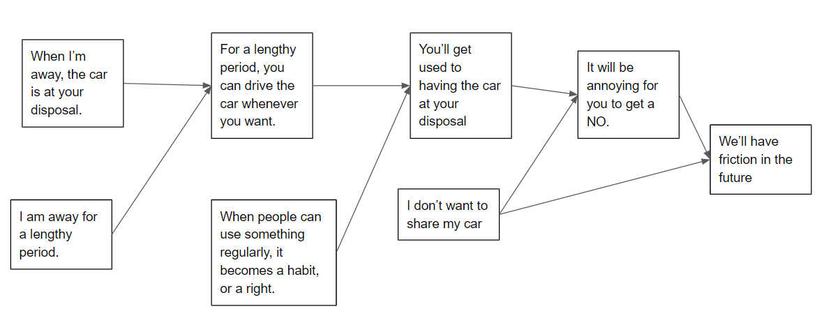 Alex has some reservations, but isn’t able to articulate them clearly and gives his son a non-committal “Let me think about it.” as an answer. After some nudging from his wife, Alex does think about it and after floundering through a few items that reveal themselves to be excuses puts his finger on the real reservation. He doesn’t want to share his car, and if Dave has free reign over it for long enough, it will quickly become “their” car, and this will damage their relationship. His negative branch diagram eventually goes like this: