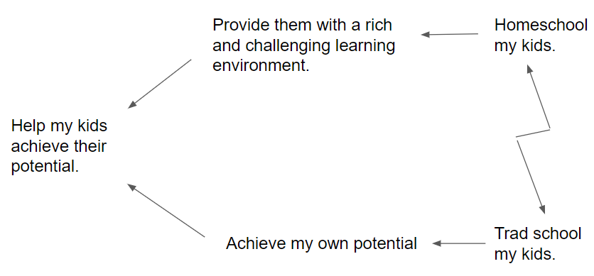 These are simple examples for people who are being introduced to this mode of thinking for the first time and a bit tedious to specify, but the value in being this meticulous is the airtight logic chain that you’re building. Perhaps you don’t know for sure if charter schools will provide a satisfactory environment, but you now have a well-formed, specific question to answer in order to get out of your conflict.
